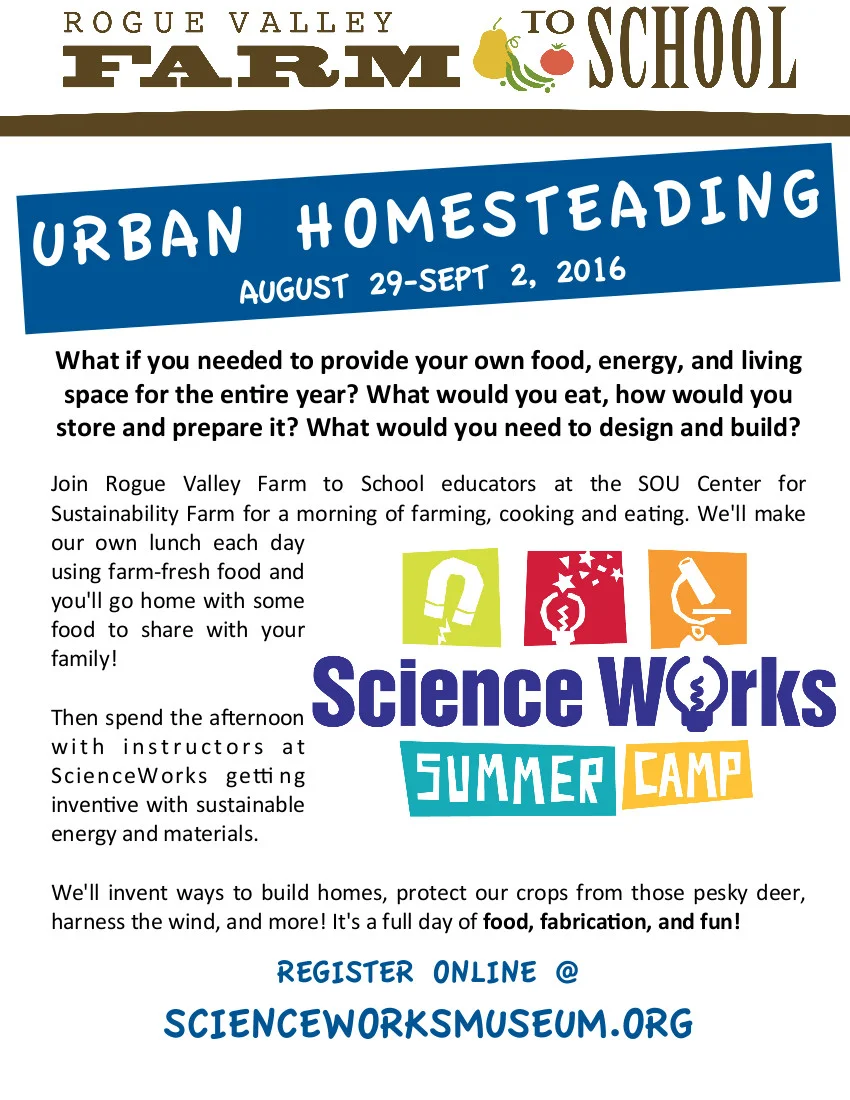 What if you needed to provide your own food, energy, and living space for the entire year? What would you eat, how would you store and prepare it? What would you need to design and build? Join Rogue Valley Farm to School educators at The Farm at SOU for a morning of farming, cooking and eating.